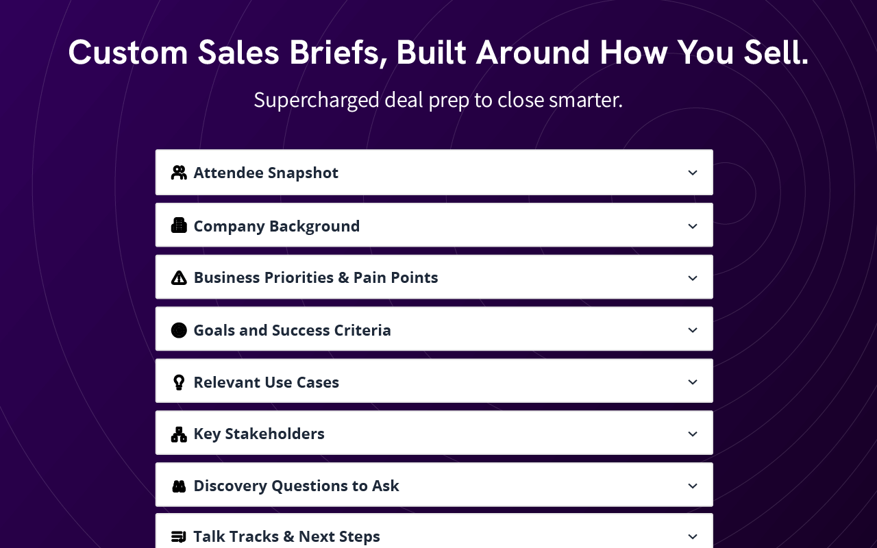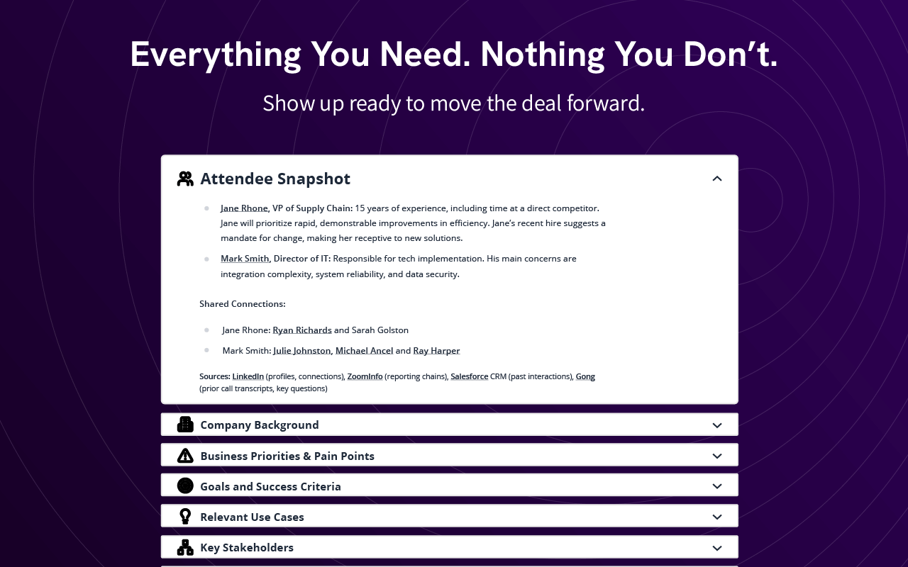 Sales reps were wasting hours manually researching accounts, digging through fragmented data sources, and assembling context for calls. This reduced selling time, slowed ramp, and created major inconsistency in how teams prepared. The brand needed to position PrepMe as the modern standard for intelligent sales readiness.